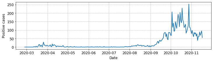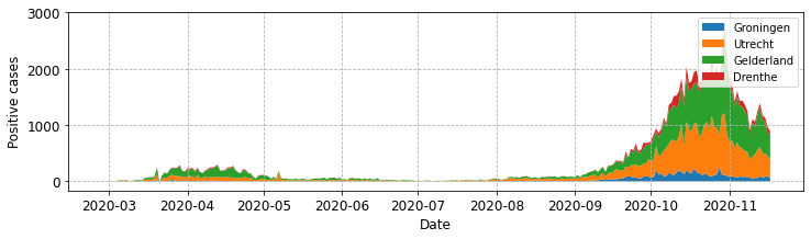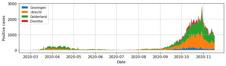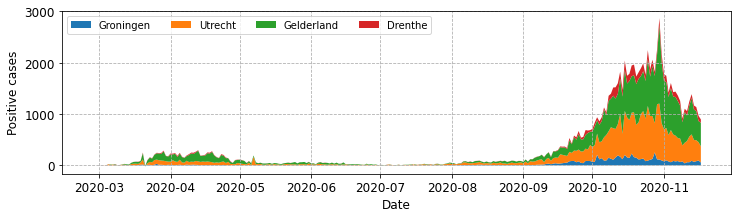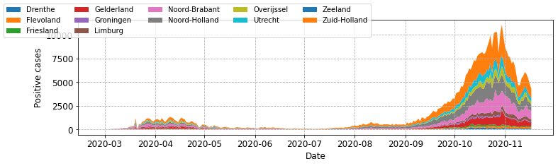 fig, ax = plot_stacked_cases(subgroups, provinces, "Positive cases")