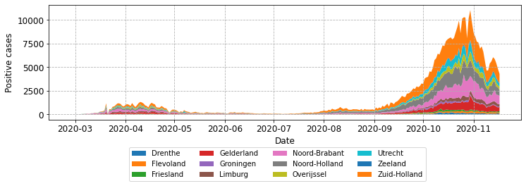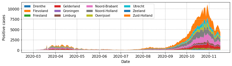 fig, ax = plot_stacked_cases(subgroups, provinces, "Positive cases",